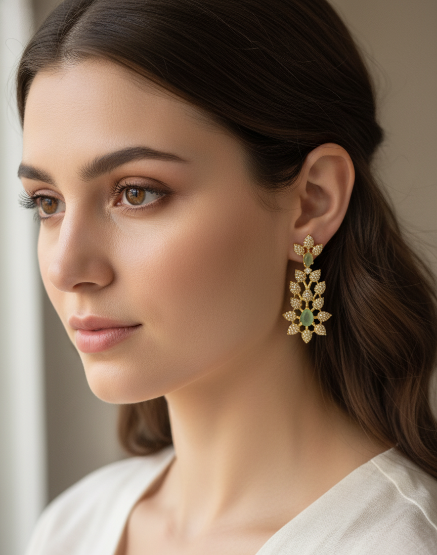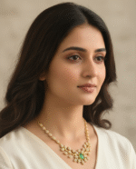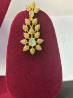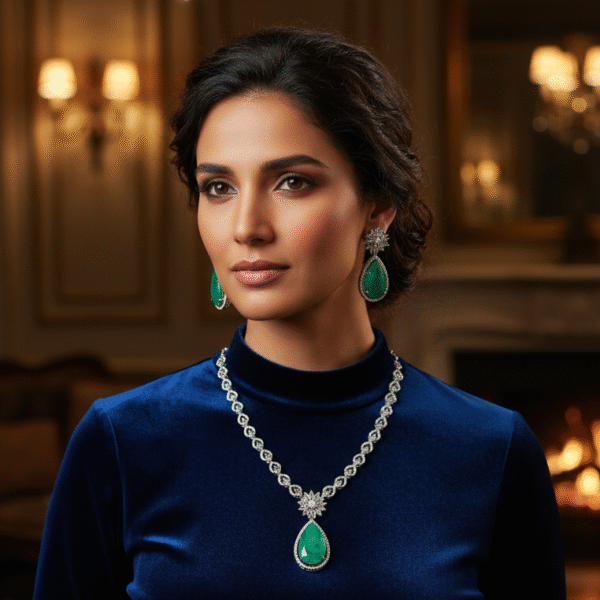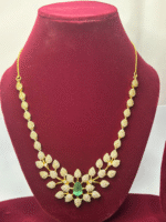 Add a touch of regal charm to your look with this American Diamond Necklace Set, beautifully crafted with premium white stones and a striking emerald-green center stone. The necklace features a graceful floral design with matching earrings, blending sophistication and brilliance. Perfect for weddings, parties, and festive occasions, this set enhances both traditional and contemporary outfits.