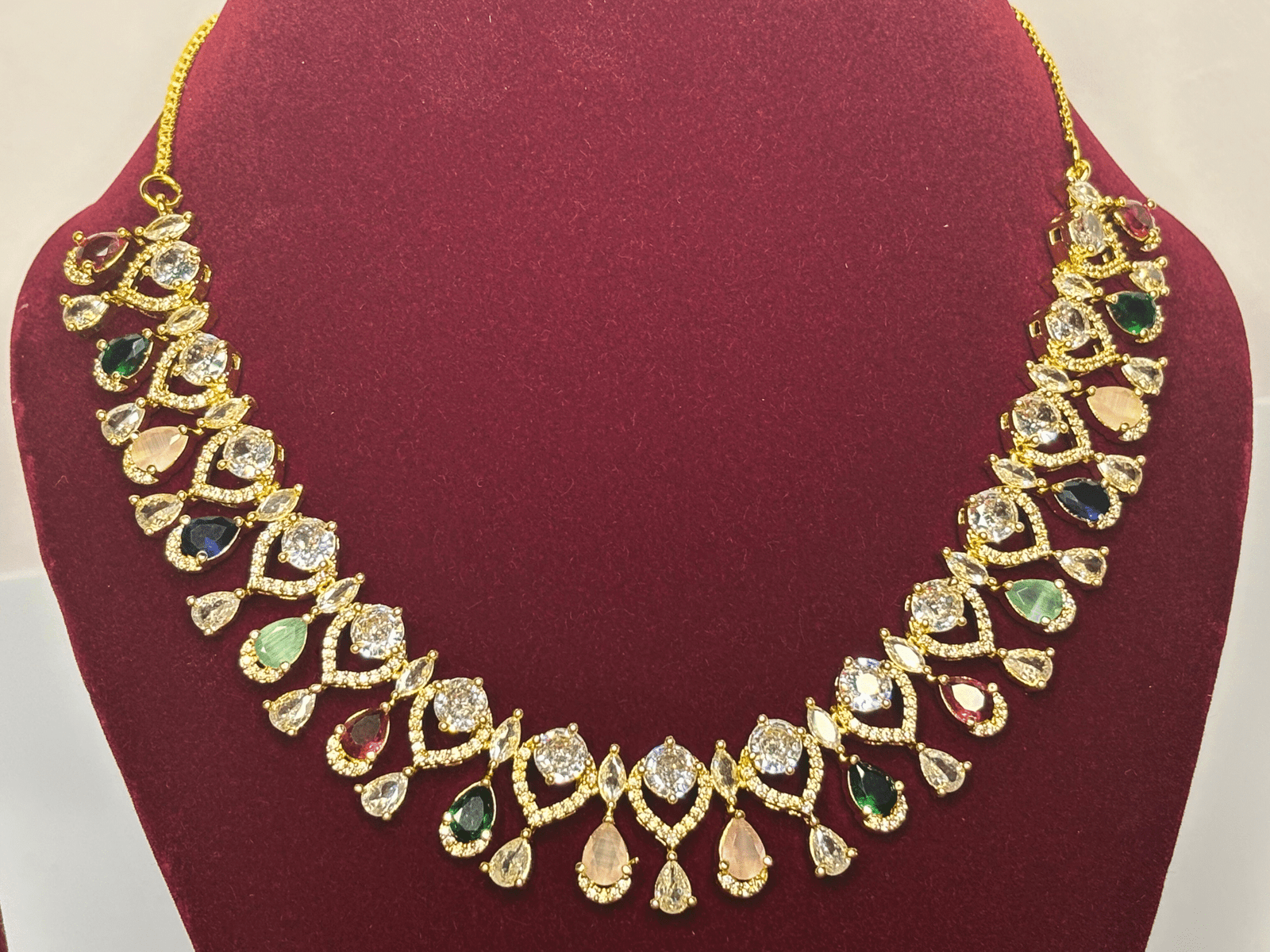 Add a touch of luxury and grace to your look with this Exquisite Multicolor American Diamond Necklace Set, crafted with precision and elegance. Featuring shimmering high-grade American diamonds and vibrant multicolor stones, this necklace set beautifully complements both traditional and modern attire.