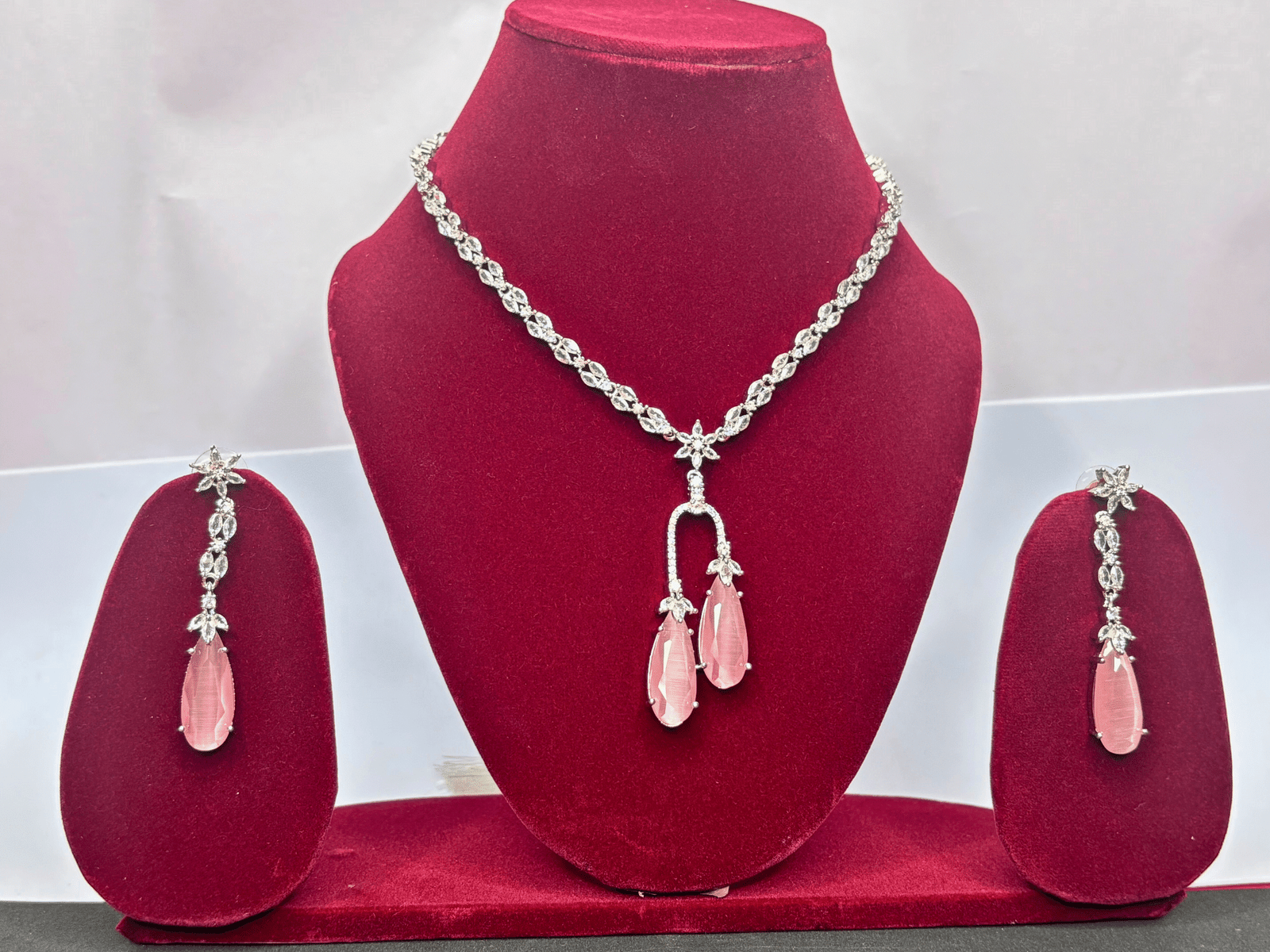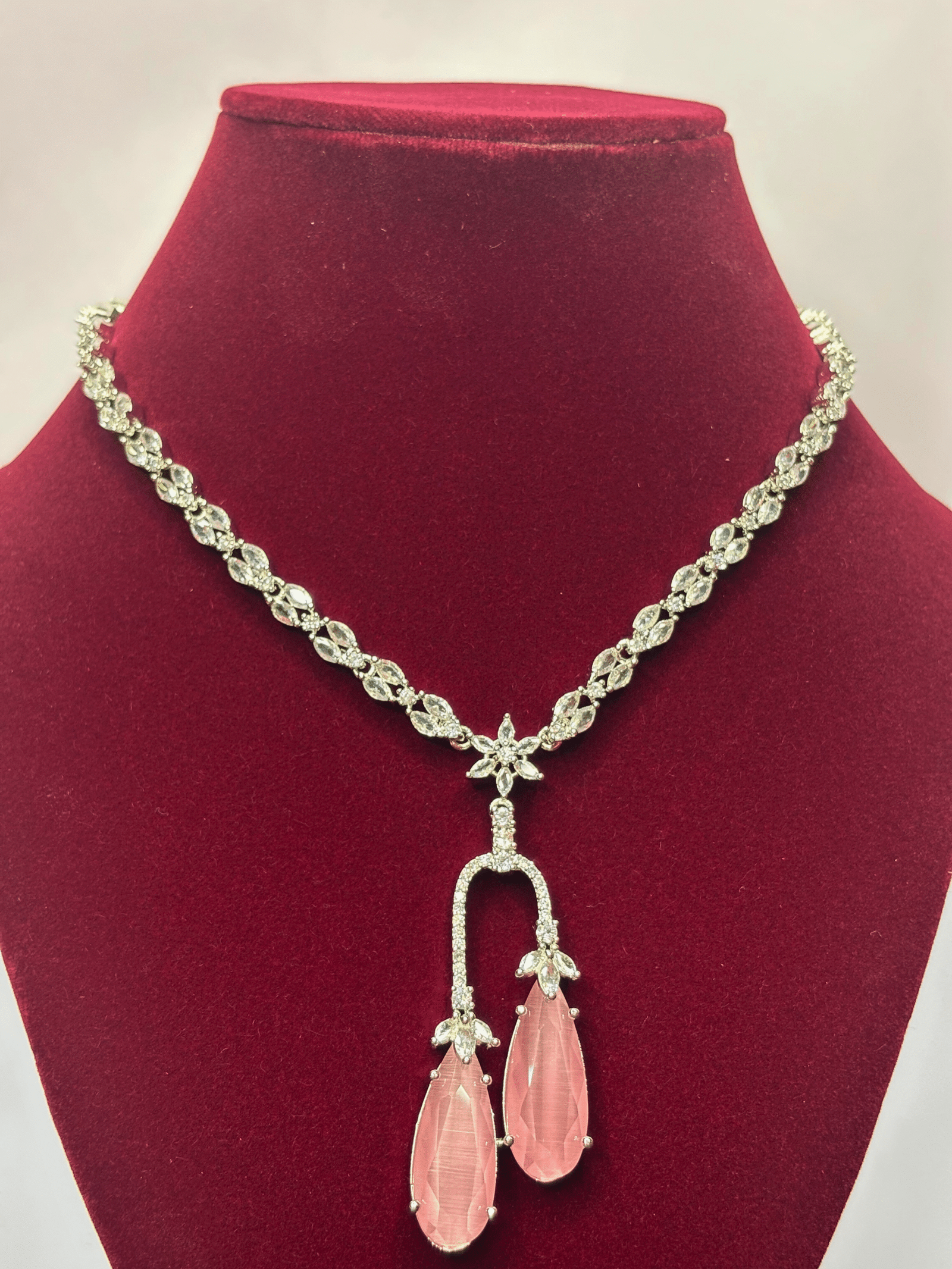 Add a touch of timeless elegance to your look with this exquisite American Diamond Necklace Set. Crafted with precision, the set features a dazzling silver-toned chain adorned with brilliant-cut American diamonds and highlighted by graceful pink tear-drop stones that exude sophistication. The matching earrings perfectly complement the necklace, making it an ideal choice for weddings, parties, and festive occasions.